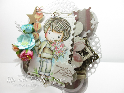 So, today I am sharing an Card and has been created using the papers by Tim Holtz, as well as a lot of dies from the La-la Land Crafts. For image I use this beautiful stamp called "Secret Admirer Luka". I use Distress INK and Markers to coloring and I made this in a Watercolour paper "Bockingford".